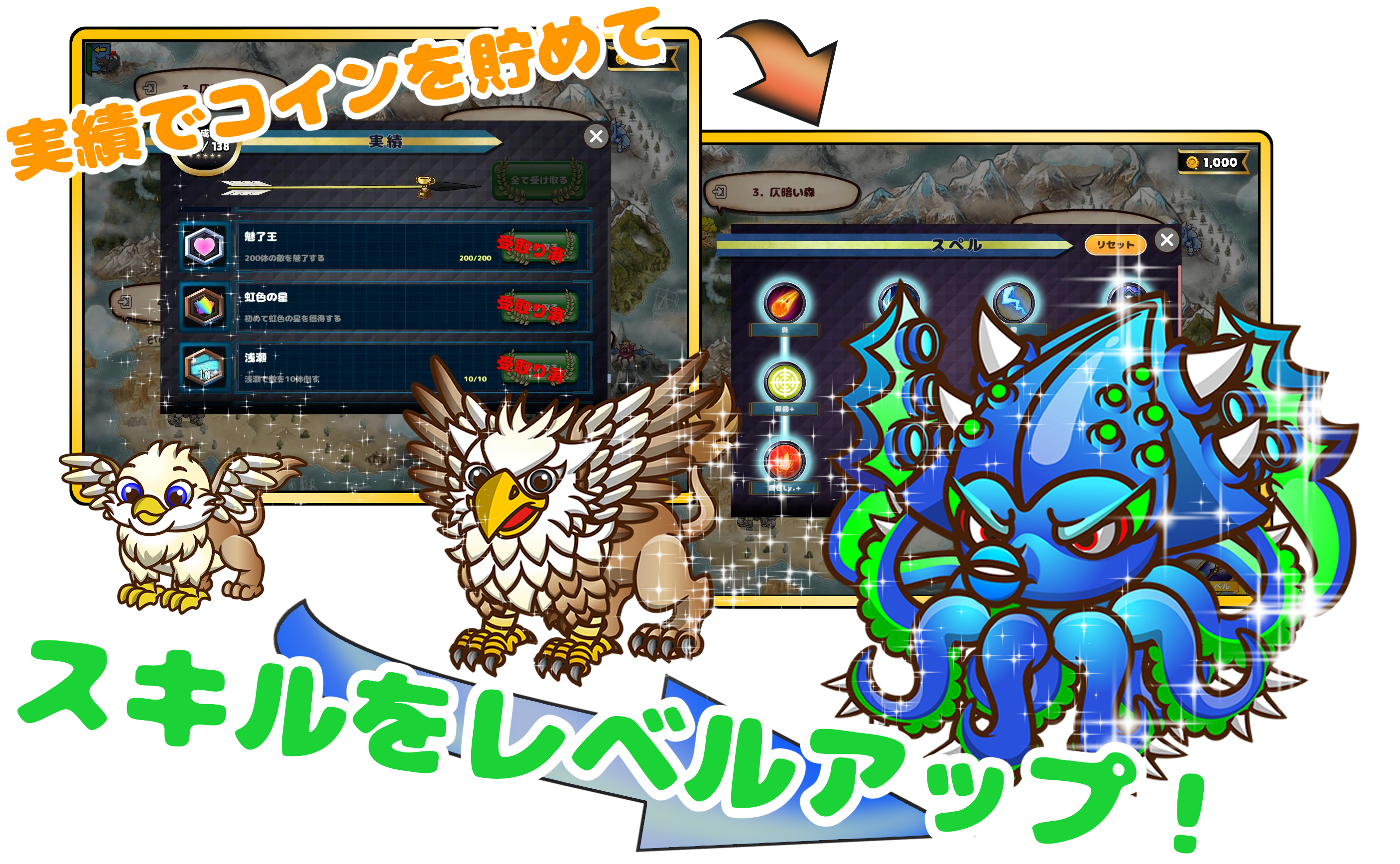 特別な召喚獣を配置して敵を足止めすることができる。育成するとより強力な召喚獣を喚ベるぞ!